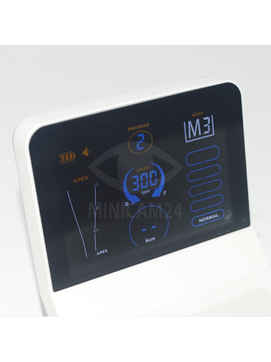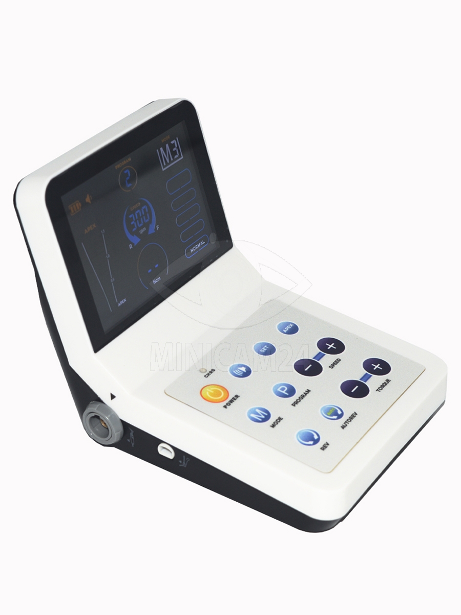 Эндомотор управляется сенсорными элементами и позволяет сохранять до 9 индивидуальных программ. Такое сочетание характеристик делает прибор удобным для точного контроля и настройки параметров при лечении корневых каналов.